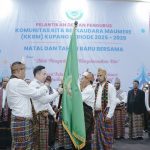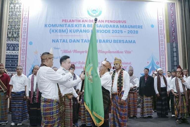 Wali Kota Kupang, dr. Christian Widodo menyerahkan pataka kepada Agus Bajo pada pelantikan Badan Pengurus KKBM Kupang periode 2025-2028 yang…